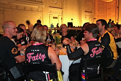 The Fundraising Appreciation Dinner, as I believe it was called, had great food, great speakers, and was totally dominated by Team Fatty, especially since most of us — not me, I wore something a little more serious since I would be giving a serious talk — wore Fat Cyclist jerseys there.