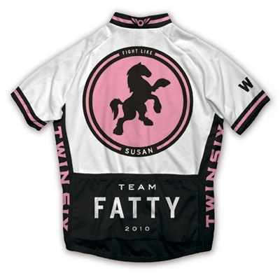 Fight Like Susan: Where the Fat Cyclist jersey says “Heavyweight Horsepower” in the circle that goes around the clydesdale, this jersey has our motto: Fight Like Susan. People will ask you what this means, and the answer is simple: We will find ways to fight cancer doing what we love. We will fight cancer with focus, creativity, and outrageous endurance.