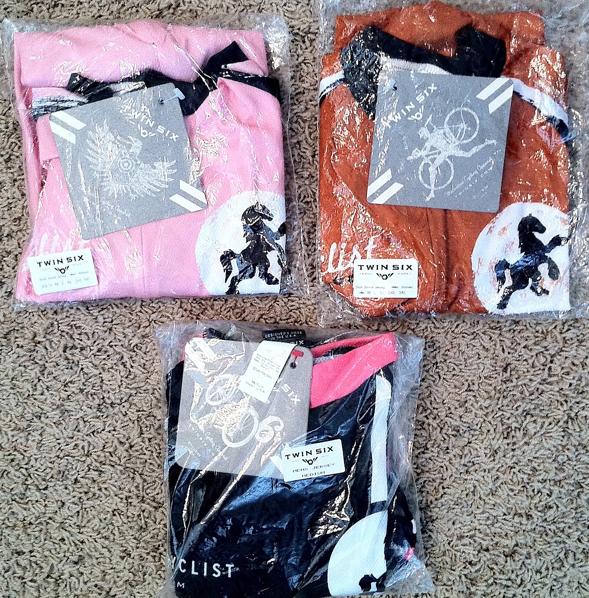 I have a few Fat Cyclist jerseys from years gone by — one from 2009, two from 2008. Part of me thinks I ought to hang on to them, but I’m giving them away, because I already have enough Fat Cyclist jerseys that I can go a month without wearing the same one twice.